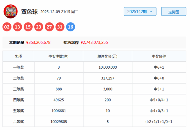 双色球第2025142期开奖号码为:02、13、15、23、27、31+16。其中红球三区比为1:2:3,奇偶比为5:1,包含2个重号:02、13,蓝球出当今第四区。